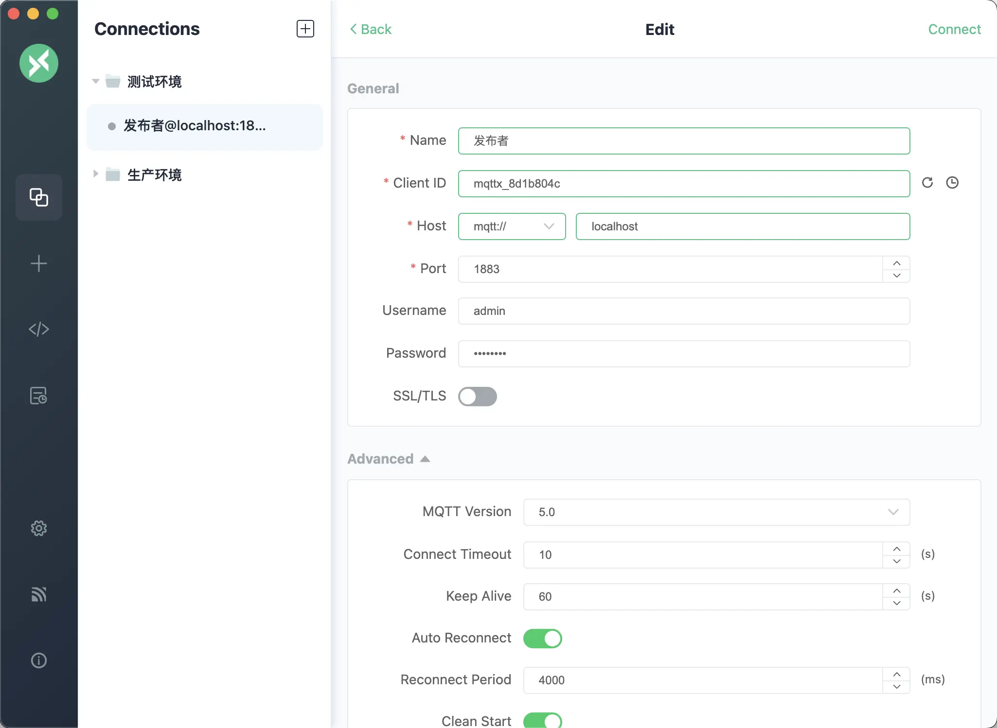 - Name: 客户端的名称,仅用于MQTTX界面显示。