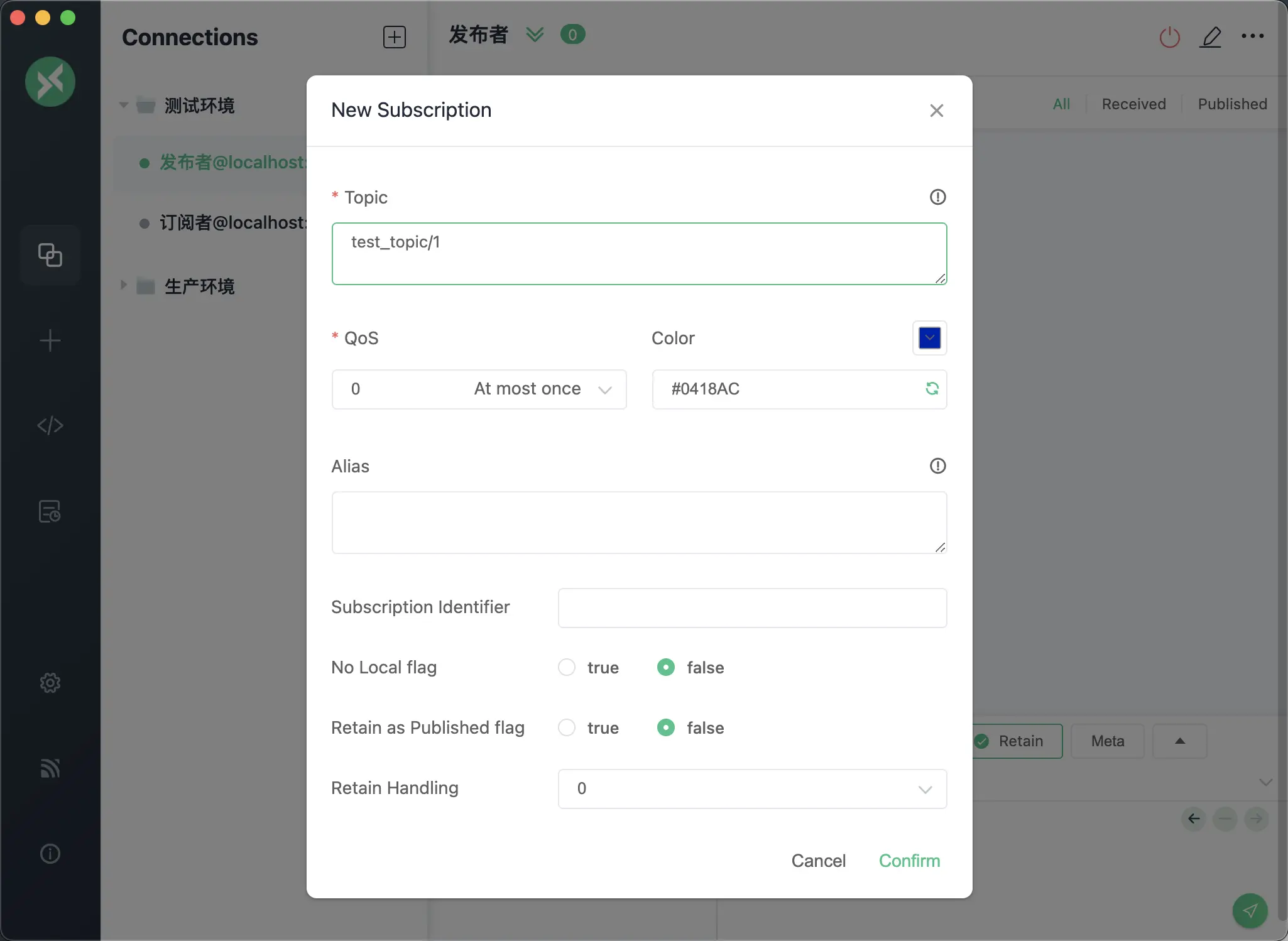 在图中需要修改Tpoic的数据内容,修改为test_topic/1,修改完成后点击Confirm按钮完成订阅行为。此时界面如图所示