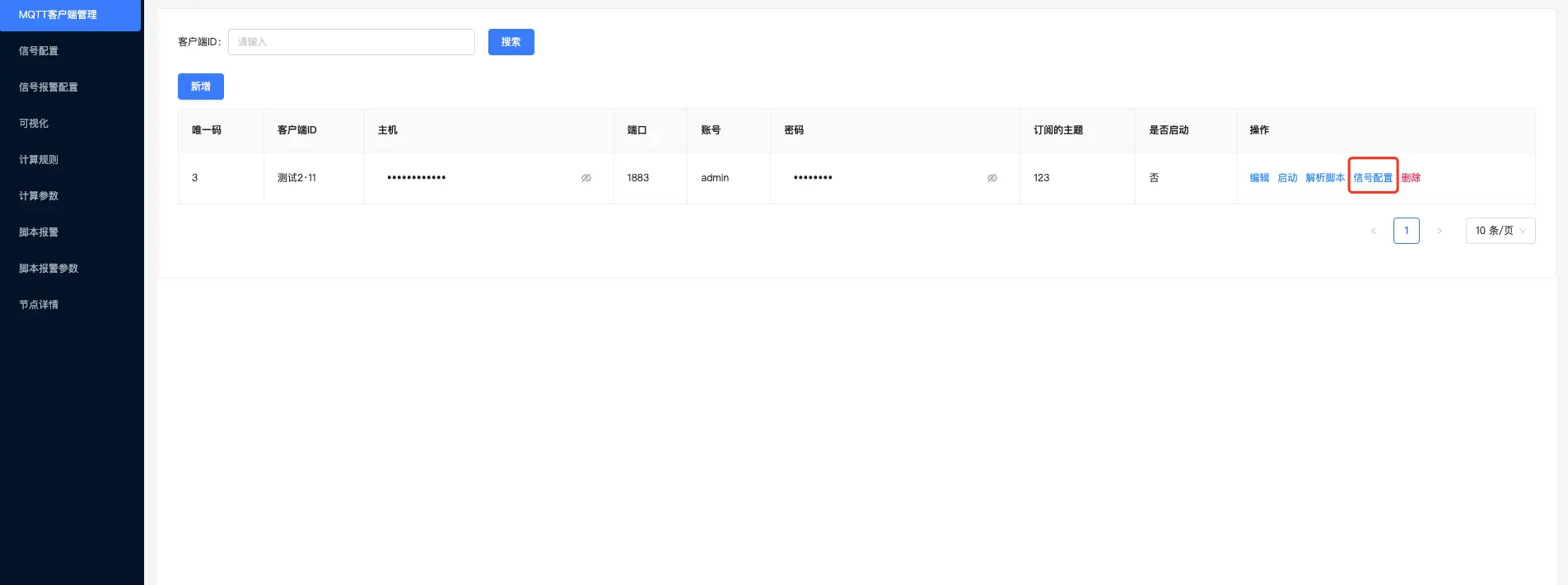 操作如下:单击操作栏中的信号配置按钮,跳转到信号配置页面,在信号配置页面中,客户端ID,默认就是该条数据的客户端ID