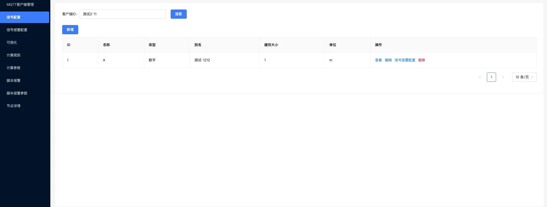 操作如下:可以根据MQTT客户端管理页面中,数据列表操作栏中的信号配置进入到该页面,可以单击左侧菜单栏中的信号配置进去,之后单击新增按钮出现新增信号配置弹窗。