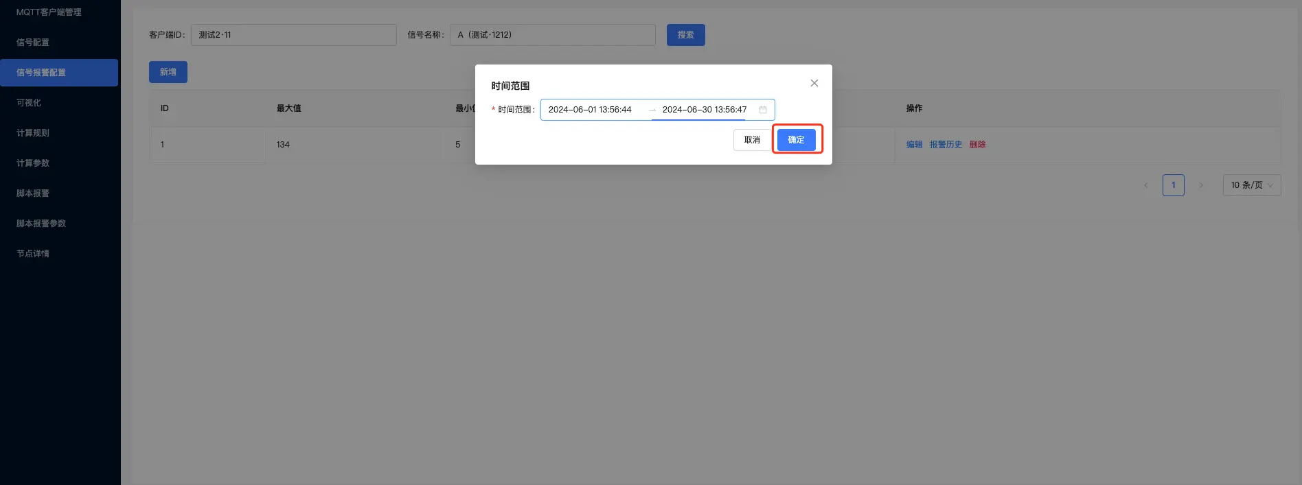 操作如下:在信号报警配置页面中,通过筛选不用的客户端ID和信号名称,展示该客户端和信号名称下不同的数据