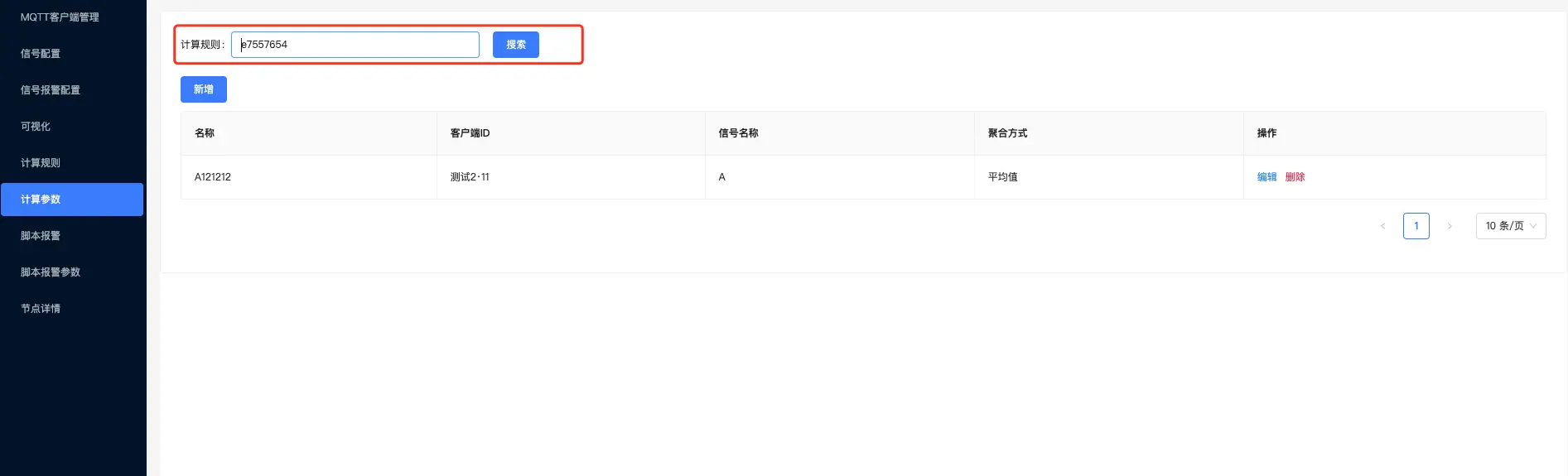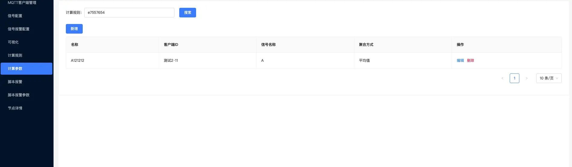操作如下:可以根据计算规则中,数据列表操作栏中的参数配置进入到该页面,也可以单击左侧菜单栏中的计算参数进去,之后单击新增按钮出现新增信号配置弹窗。